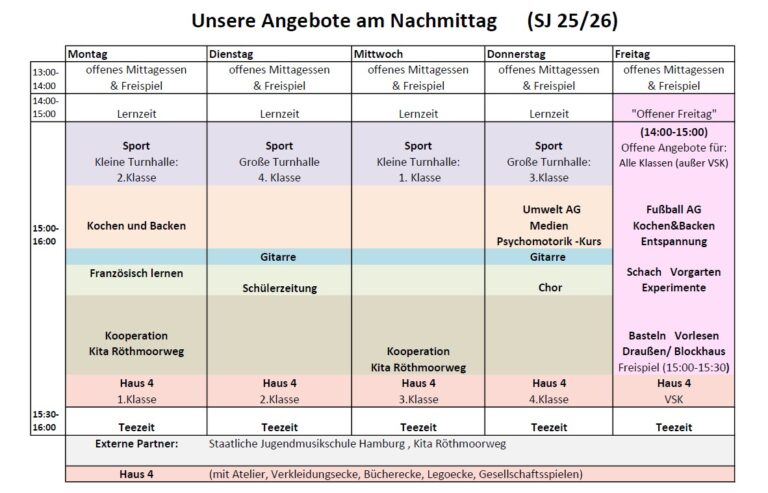 So bietet sich den Kindern einmal Woche die Möglichkeit, auch an Angeboten teilzunehmen, die regulär nicht in ihrem Jahrgang stattfinden. Dazu gehören beispielsweise Schach, Sport in der Turnhalle, Basteln, Entspannung, Malen, Kochen & Backen, Gartenprojekte oder das Freispiel draußen.